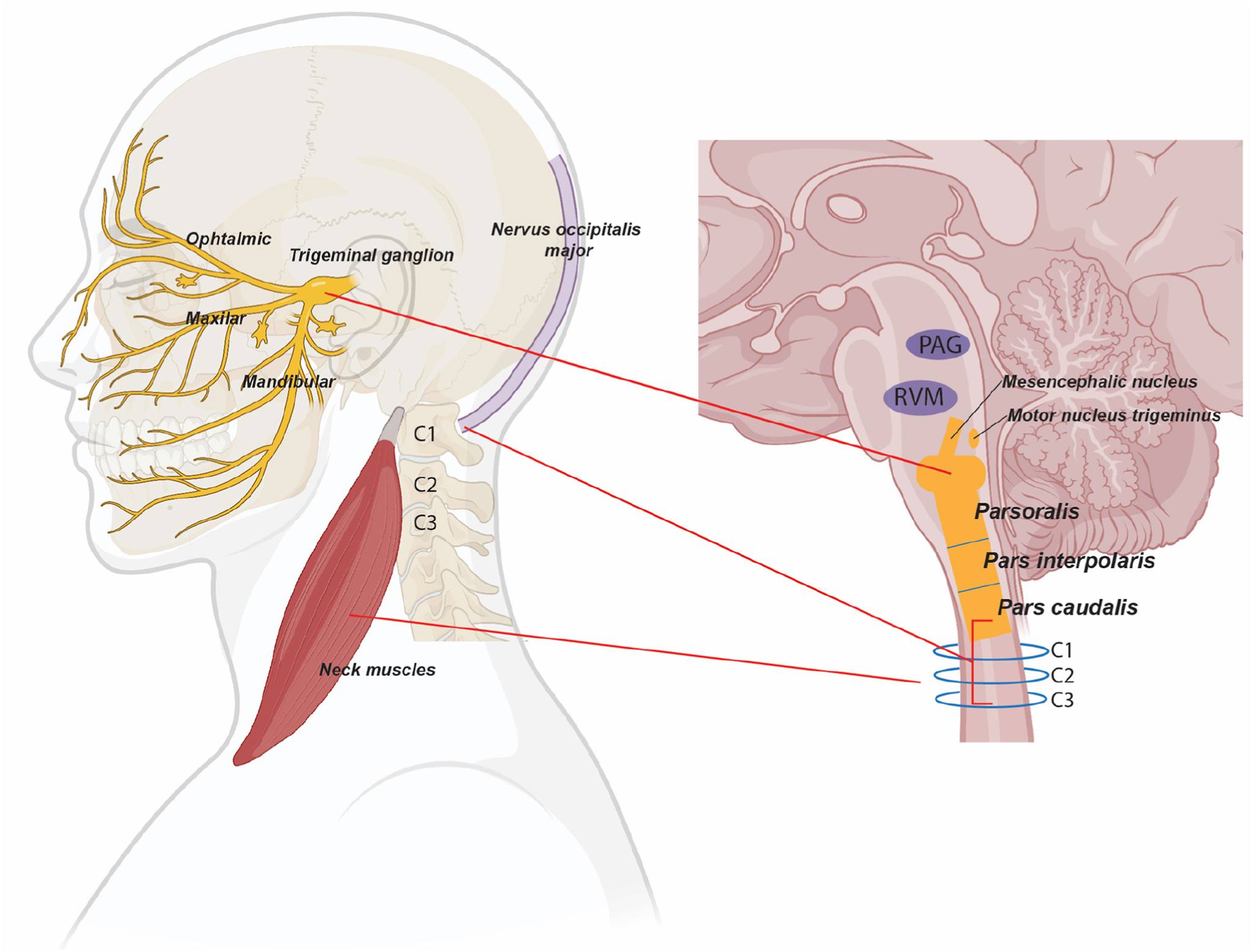The cervical spine and the brain share a deeply interconnected network of nerves. The upper three cervical nerve roots – C1, C2, and C3 – converge with the trigeminal nerve, which is the primary sensory nerve of the face and head. This anatomical overlap, known as the trigeminocervical nucleus, is the reason that pain originating in the neck can be perceived as a headache.